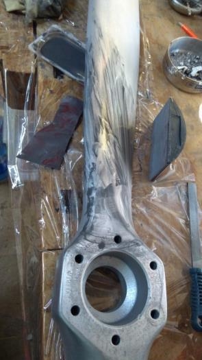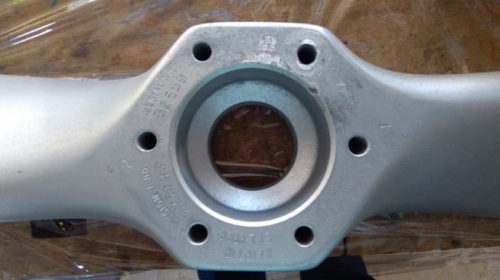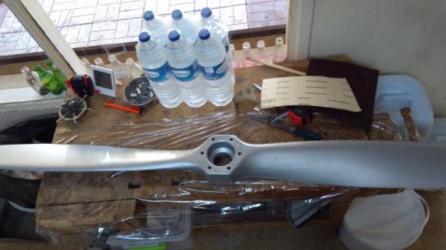 A friend gave me the propeller. It was weathered and painted with aluminum paint. I will completely remove the paint to examine the propeller properly. It is a McCauley CM7147.
