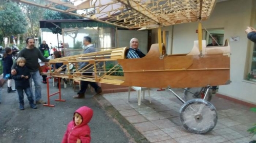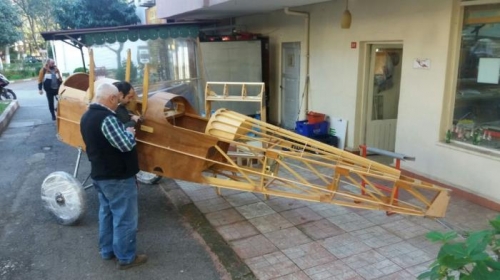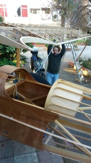 We moved the fuselage and right wing out to sunlight (the first time) to be able to trial mount the wing to fuselage (center wing) to measure for the lengths of the struts. The workshop is very small and it is impossible to mount the wing indoors.