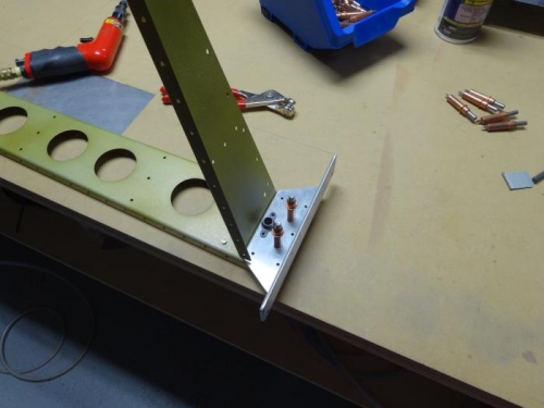 Primed a batch of parts for the rudder. This times used a filter on the vent and new can of primer and echieved very good results. (1 hr) Waited few hours and clecoed R-606PP parts together. Used rivet sqeezer for most rivets. Had to remove one rivet because it bent over, no problems removing it. Rivets 8 length had to use rivet gun because sqeezer couldn't do it. Used double sided tape to rivet tie wrap clip into place.