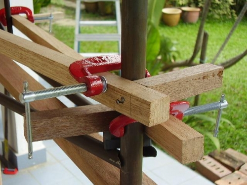 The lower tail end of the fuselage was positioned to the vertical stab using two pieces of magnet and a wooden handle. The horizantal stab alignment was again rechecked prior to tack weld.