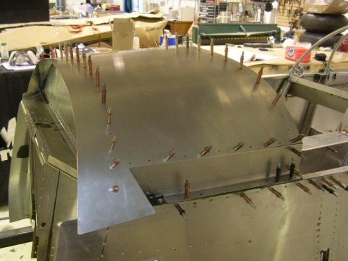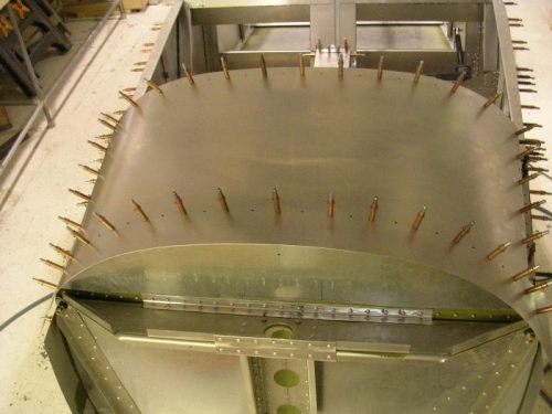 Cut out Fwd top skin, rounded and filed edges and corners..Marked center lines and pitch distance on top off instrument panel and fwd bulk head and drilled holes to #40. Aligned top skin to instrument panel and fwd bulkhead and back drilled holes from center leading out board on R/H and L/H.Then upsized holes to #30.