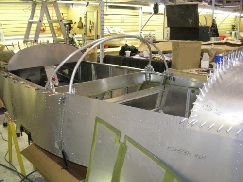Layed out upper aft skin into position. Marked out and drilled rivet spacing on Longerons. Back drilled through longerons and ribs into skin. Upsized holes to final size. Researched installation of forward mid upper skin and support tubes