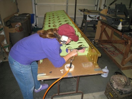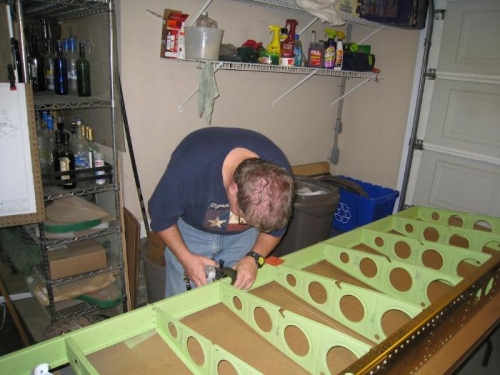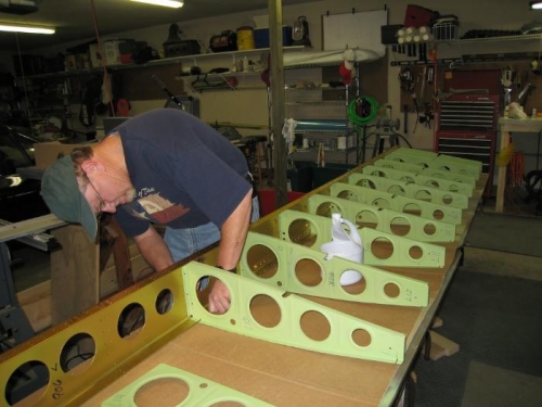 Clecoed primed ribs to front and rear spar the bucked the rivets on the front spar and used pneumatic squeezer to squeeze rear spar rivets. Only drilled out three rivets in main spar.