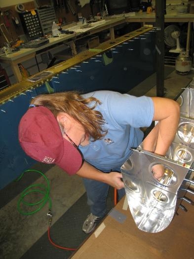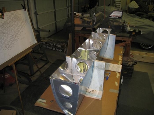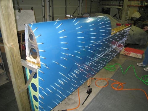 Built a cradle for the leading edge assemblies. Placed left leading edge skin in cradle and trimmed 5th leading edge rib to fit over rivets on spar. Clecoed leading edge ribs to top of skins then riveted bottom of skins... THIS WAS TOUGH!