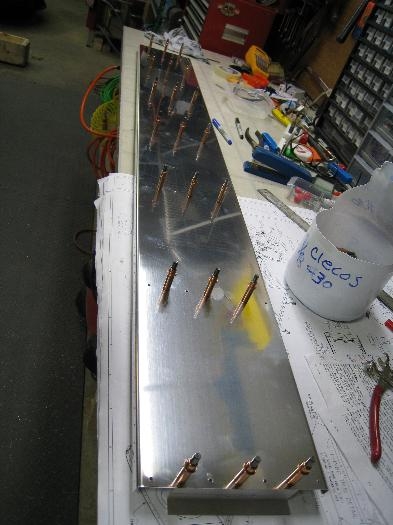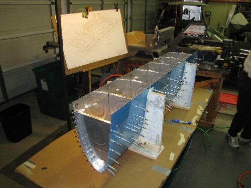 Started building up the right wing fuel tank. Clecoed ribs to skin, mounted attach brackets to the baffle and hung tank on main spar and drilled out all connection holes.