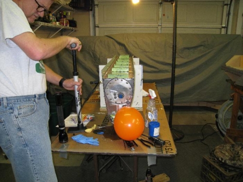 Put right wing on stand and rebuilt the right wing AEX tiedown bracket. Made an attempt to leak test the tank with ballons with out much luck. Couldn't get the ballons attached without poking holes in the ballons.