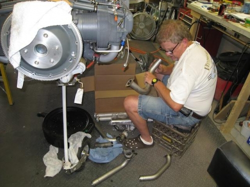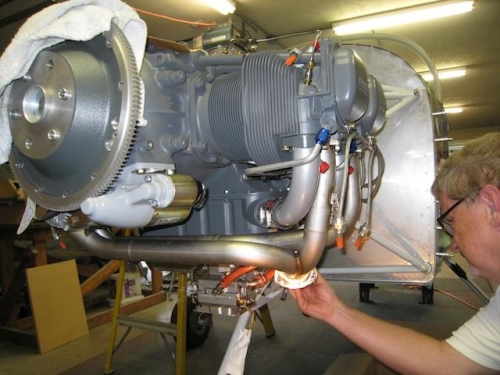 I installed exhaust system parts to the engine while Beth primed cowl.