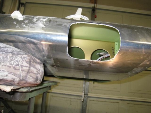 Cut hole in leading edge of left wing for landing light lense then mounted light bracket and ran wires - over several days.