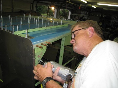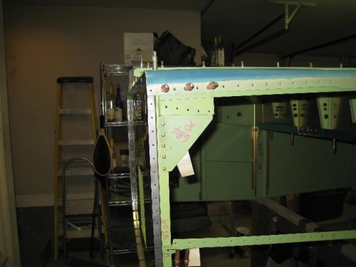 Removed right side skin & riveted inside aux longerons & gussets.