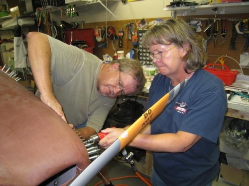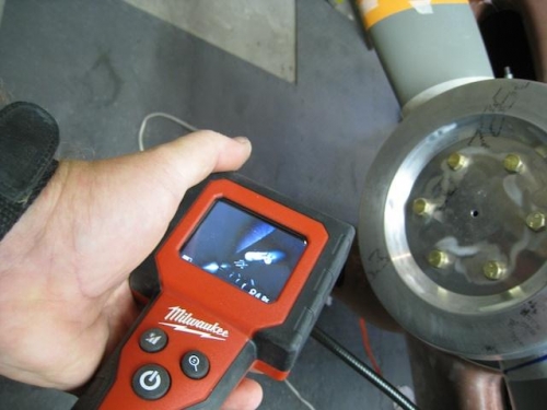 Beth & I drilled cowl side hinges and used my proct-scope to look inside the cowl to check clearance.