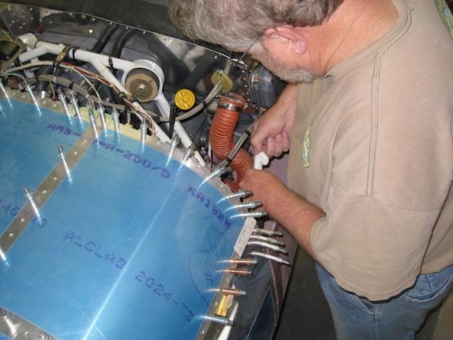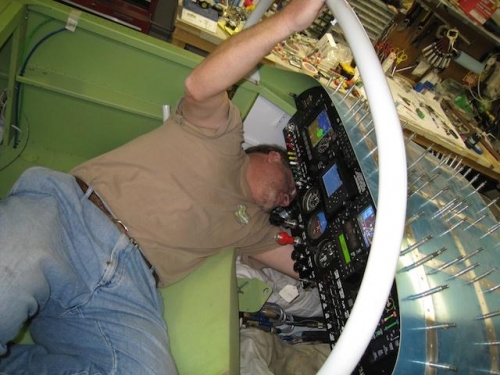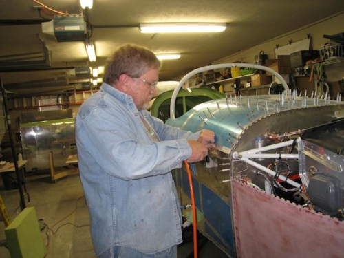 I worked on final panel check before riveting top skin while Beth worked on nose gear fairing.