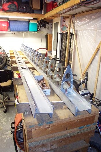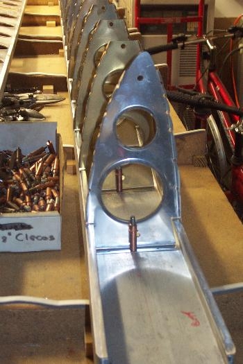 Drilled #30 holes in spars for initial rib alignment. Trimmed nose ribs for right spar to fit around spar flanges. Drilled ribs and clecoed to spar.