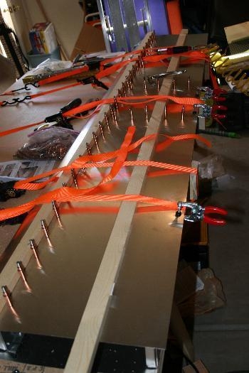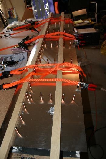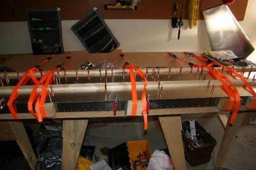 This proved to be one of the hardest things to do so far...Every time I clamped, the assembly twisted. It tool us hours just to line up the spar, and have the ribs still showing on the rivet line.