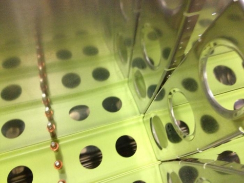 I completed drilling the skins today and then disassembled the parts. I deburred all the holes that had been drilled during this process then used the pneumatic squeezer to dimple all the ribs.