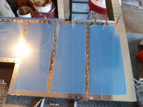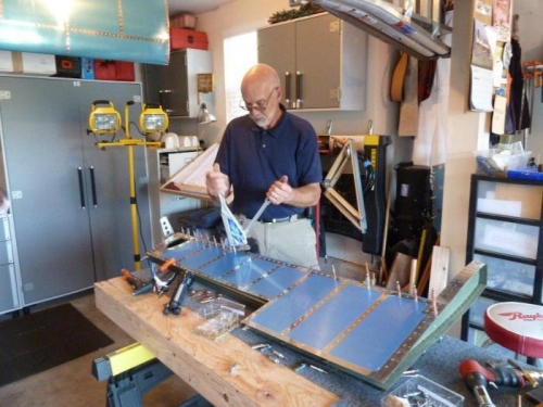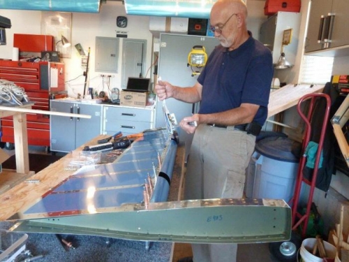 Riveted the spar to the top side of elevator skin. This is a tough maneuver for one person. I made a couple of rivet gun marks on the skin, so I hauled it over to a fellow builder's hangar for an opinion. Not structural problem and a little sanding and filler will smooth it out. I need to be a little less macho and ask for help occasionally to prevent this kind of boo-boo.