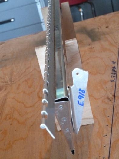 This took a little more time than I thought for such a small piece. Some tight quarters to work in. I had to make a bending brake to put a final bend in the trailing edge of the tab. I now have it completed with electric trim tab rod attachment on. The hinge is riveted to the tab spar and ready to attach to left elevator.