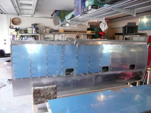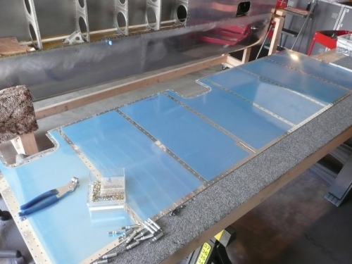 May 14, 16, 17 were spent working on the bottom wing skins. This meant match drilling, deburring and dimpling/countersinking over 1000 holes in the skins, inspection covers, spars and ribs. I also primed the inside of the skins. I now have them about ready for riveting; however, I will be moving them to a friend's hangar for storage. I will rivet them at a later date.