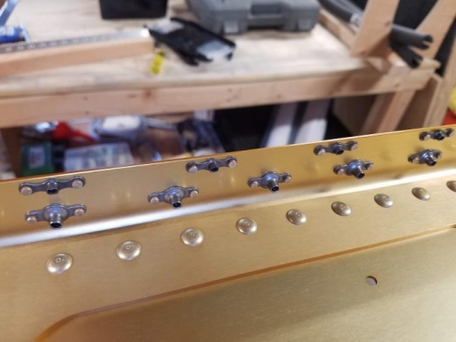 I moved on and attached the K1000-4 center section attach platenuts to the forward side of the spar and countersunk their attach holes. I then spot primed all of the holes where annodizing was removed from the spar.