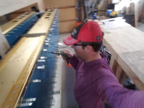 I got a lot accomplished today. I match drilled all the holes in the main skins and the wing skeleton. I also drilled and dimpled the wing inspection cover plates and extended the lines on the wing skins on to the cover plate on each wing that lines up with the tiedown hole. Hopefully this makes it easier to locate the hole on the leading edges.