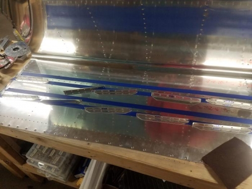 Today I began sealing the right fuel tank. I started by masking off the stiffeners so that I wouldn't get sealant everywhere. Then I scuffed all the mating surfaces and cleaned them with MEK. I sloshed the rivets in MEK as well. I then mixed the sealant and went to work spreading it on the tank skin. After that I put the rivets through and taped them with back rivet tape. I put the stiffeners on the rivets and back riveted them to the skin. I filletted the sealant around the stiffeners and added a dollop of sealant to each shop head.