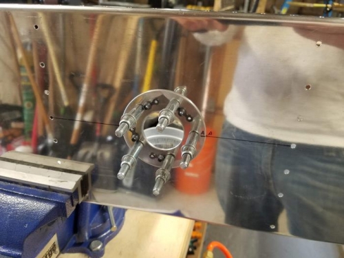 The first thing I did today was rivet on the reinforcing ring to the left tank baffle for the fuel sender gauge in the 2nd bay. I had to do this because I'm putting a flop tube in the left tank. I dimpled the baffle and countersunk the ring to accept the dimples. Then riveted it on.