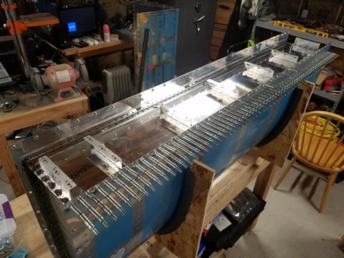 I moved on to riveting the pop rivets in to the ribs and then pop riveted the middle Z brackets on. I moved on to the end Z brackets and used the rivet gun to rivet those on, followed by the rivets on the back of the end ribs.