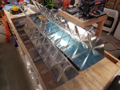 Today I began working on the ailerons. I spent most of the day separating the skin stiffeners, cutting them to shape, and deburring them. I then clecoed all of them to the aileron skins.