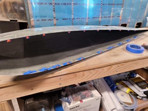 After I trimmed the trailing edge I taped magnets to the inside of the tip to hold it on while I match drilled the holes through the skin. That worked really well. The tip still flexed a little bit but the magnets held it in place and I was able to drill all the holes.