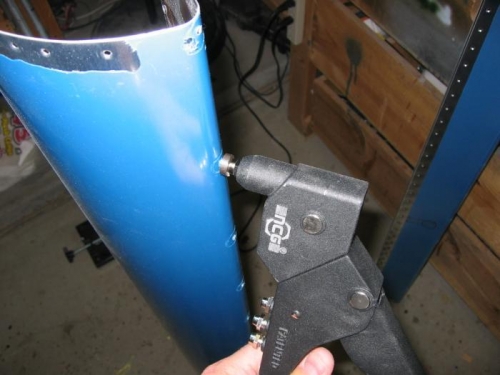 I did not like the vans technique to allow the pop rivet dimple the skin into the pipe counter weight. I fabricated a female dimple die from a pipe nipple to form to the round leading edge. Worked pretty good!