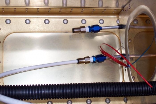 Installed the pitot fittings. I installed an extra pitot line incase I decide to use a AOA pitot in the future. I also ran a 16 gage power wire incase I decide to install a heated pitot in the future. I also started riveting the access hatch nut plates. I got 4/6 completed.