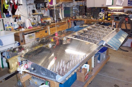 Finsihed riveting the access hatch nut plates. Laid out a wing to prepare for bottom skin riveting. I spent some time figureing out the riveting sequence as it is very critical at this point. Realized that it will take two people to knock this out. Maybe next week.