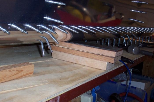 Finished backriveting the bottom of the tail cone skins. I used a block with a metal rivet plate. Worked pretty well and allow me to do it by myself.