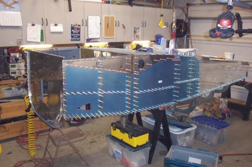 Finished preping left side skin and reattached it to the assy. Removed the right skin and repeated the dimpling, deburring etc..... Reattached it to the fuse. Riveted the 684 members to the firewall. Reattached the firewall and cleaned up. Got a lot of work done. The side skins should be on for good now.