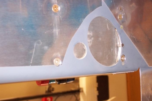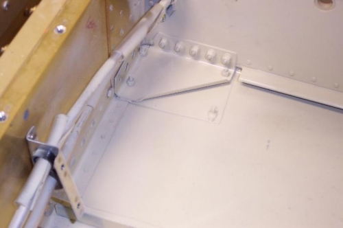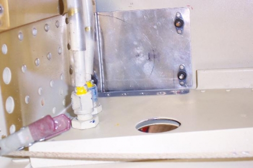 Made up and installed patches where the gear mount holes where. Installed the corner bracket, match drilled and painted the area. Started fitting up the cover skin that covers up the fuel line.