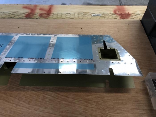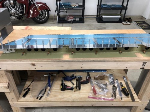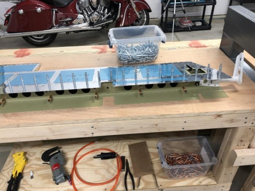 Riveting the skins together. I was able to reach into the skins with the pop rivet gun and squeeze all of the rivets without the aid of pipes for extensions or the special tool they have you create. It was a little easier than the rudder, I think. Also, I would highly recommend getting the special bucking bar from Cleveland Tool for riveting the trailing edge. This makes it very easy.