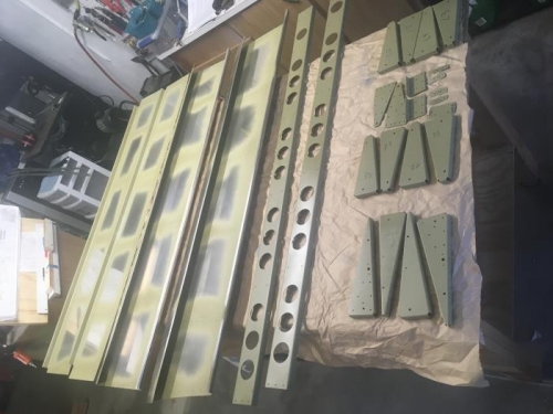 Drilled inboard Rib for Nutplate. Countersunk both Spars and inboard Rib Reinforcement Plates. Smoothed right Flap Top Skin edges. Deburred, scuffed, cleaned and primed all Flap parts.