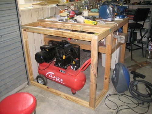 Needed to quieten my compresor before starting serious work, Decided to build it in under the work bench, Will still need to take the side off for extended running to stop overheating and it needs an access point to allow draining of the tank. All in good time.