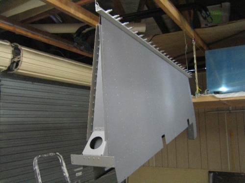 I applied a thin film of epoxy to the trailing edge to try to hold it straight while rivetting. As soon as the epoxy was applied, I clecoed the trailing edge to a length of aluminium angle to hold it true. I then hung the rudder while the epoxy dried. I regret doing this as the end result shows some distortion of the trailing edge due to variations in thickness of the epoxy. I had tried in great detail to avoid this, including the extent of the clecoing of the seam, but i am still unhappy with the result. I think i could have done just as good a job without the epoxy - probably better. However, the end result is adequate, and the riveting of the trailing edge (which I did completely with a hand squeezer) ended up OK.