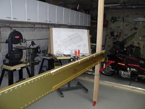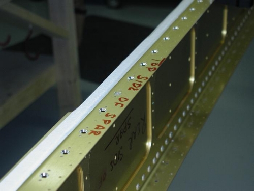 Countersink fuel tank attachpoints on righr spar rear flang. It was in the 90s today and it is in the high 80s tonight at 9:00 pm. Made a good start in the right spar, will finish the countersinking tomarrow night. There will be a point where I won't be able to work on both wings at one time, but I will go as far as I can and then work on the left wing untill it is finished. Going to order my paint and strobes tomarrow allong with a flop tube for the tanks. Also going to order the electric trim servo. Dont like the manual trim.