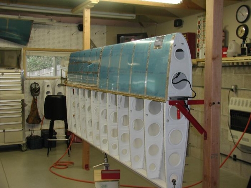Finished up the landing light tonight and did a smoke test on it. Works good. Also had Jenny come out tonight and helped rivet the leading edge to the wing spar. She did a good job when you consider she had to buck rivets that she could not see. After the leading edge was all done I mounted the fuel tank.