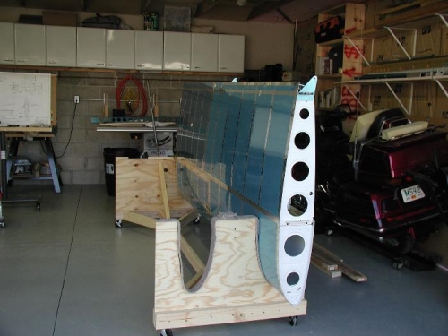 Allen and I built the wing jig and placed the left wing into it. I also made a slight modification to the jig to hold the skins so they can't get damaged. I don't have a picture of it but it works well.