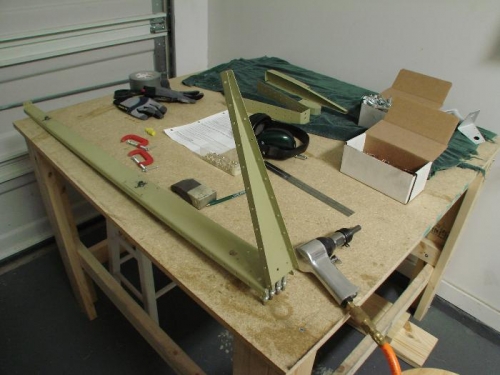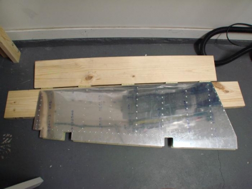 Susan helped me rivet the stiffeners inside both the right and left elevators. I then riveted the trim tab stiffener (E-615PP) to the left elevator and put it aside for later. I used the wooden bending break to bend the right elevator to its proper angle. Finally I started riveting together the right elevator, beginning with the spar reinforcement plates and nutplates.