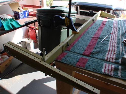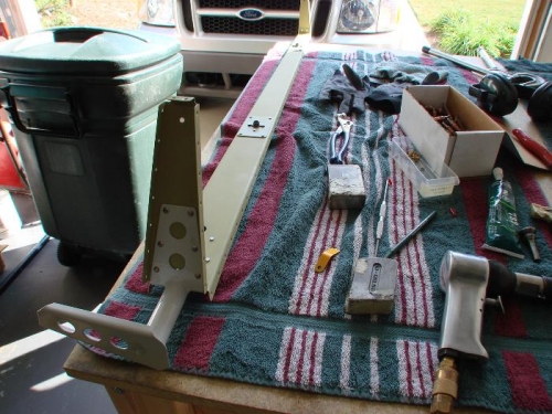 I riveted together the skeleton for the left elevator, then riveted the skin to it using both a gun and squeezer where appropriate. The left elevator itself is finished other than rolling the leading edge and attaching the fiberglass tip. Next I have to build the trim tab and attach it.