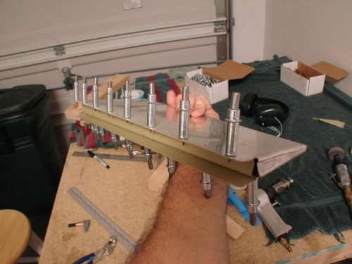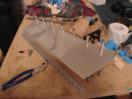 I started work on the trim tab by making the final bend in the control surface, then used the blocks I had already made for the elevator to bend (by hand and rivet gun) the end tabs of the trim tab. I match drilled the piano hinge to the tab and drilled the end tabs for blind rivets later.