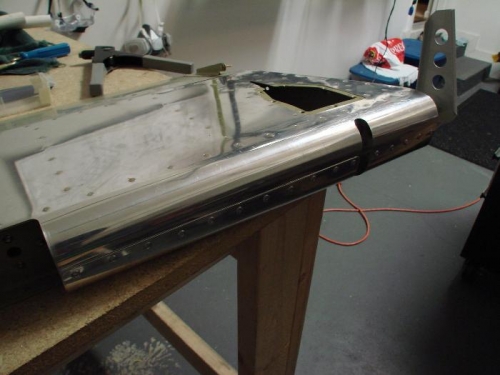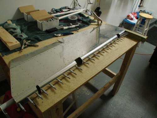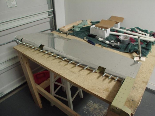 I finished blind riveting the skin in four places. Next, I used duct tape and both a steel pipe and pvc where necessary to roll the leading edges of the left elevator. I match-drilled all the holes and added more holes in between. I then pop-riveted the leading edge together except for one section where I ran out of blind rivets and had to order more.