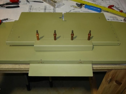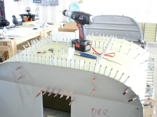Today I kept working on the forward deck skin and panels. After all the ribs, panels and skin were on, I match-drilled the skin to the skeleton (and firewall) and drilled the holes for the various brackets/angles that had to be done while assembled (Oh what fun getting upside down under the panel in the fuselage!). I finished fabricating and adding nutplates to the instrument panel attach angles (2 per side) and installed them once everything was removed. I dimpled/deburred all the parts except the skin, and I drilled and attached the instrument panel and subpanel engine control brackets.