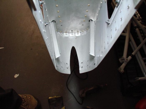 I began working through the plans to verify the quickbuild work for the aft bulkheads of the fuselage. I removed the F-712 (very last) bulkhead and finished the interior rivets on it. I then used the template in the plans to map out the cut for the WD-409 tail spring mount channel in the bottom aft skin. Using a dremel tool, files, and sandpaper, I cut the channel to size and edge-finished it. I also began aligning and drilling the bolt attachment holes for the mount with an angle drill, but needed to order a couple more drill bits to finish.