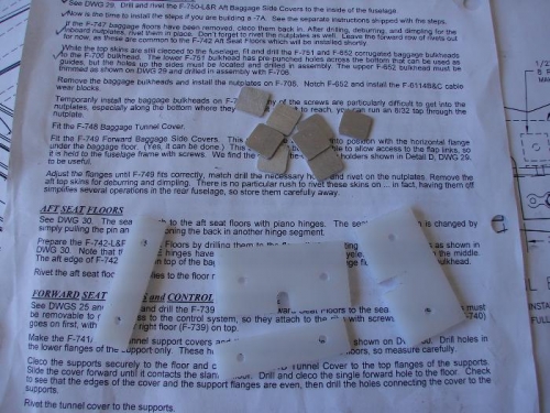 I fabricated the 8 required square washers and drilled out the cable wear blocks for where the seat belt cables pass through the baggage bulkhead. I primed the washers and then drilled the baggage bulkhead panels where required for installation. I had to extend the notches in the upper panel for a proper fit. I blind riveted the two assemblies in place. One blind rivet pulled through the panel hole, so I fabricated an additional washer to seat the blind rivet properly.