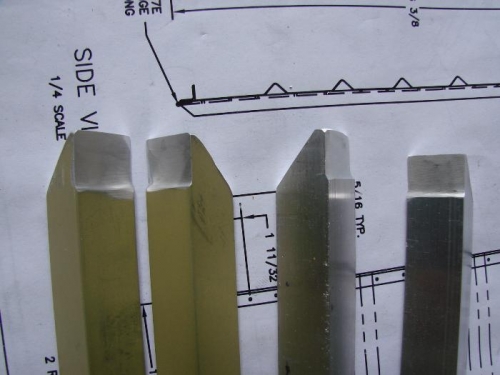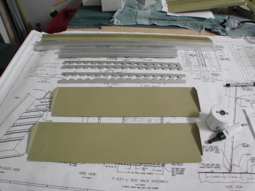 I continued working on the parts for the frames of the seats. The angle supports took most of the time since the ends of each one had to be drimmed to spec. One end of each needed to be beveled to fit around the seat base hinges. The seat back braces also had to be trimmed on the ends in "triangular" shapes. I'll need to cut lightening holes in them next.