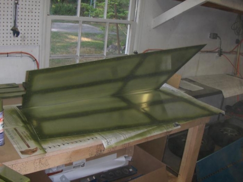 After all the deburring and dimpling, I diluted some Alumiprep 33 3:1 with water and used it with a maroon scotchbrite pad on the surfaces I intend to prime. For parts that aren't Alclad, I did use Alodine. My method of priming (for now) is to use Alumiprep 33 with a scotchbrite, dry, then prime ONLY the areas that will see metal to metal contact. For parts that are not Alclad (angle), I will use Alumiprep 33 with a scotchbrite, rinse, dry, Aldoine, rinse, dry, then prime the entire part. One medium coat of primer is what I did today. I only got the left side of the HS done.